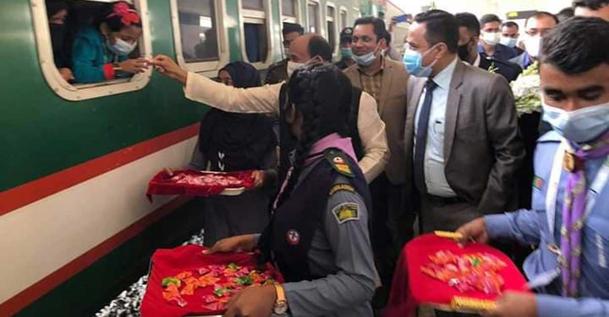 ফুল দিয়ে যাত্রীদের শুভেচ্ছা জানান মন্ত্রী