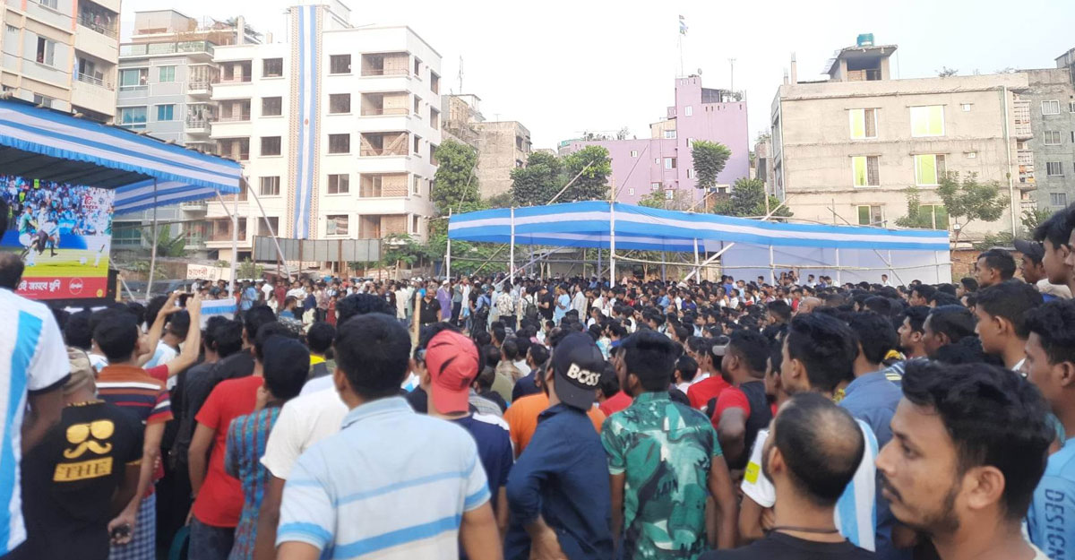 মিরপুরের ১১ নম্বর সেকশনের প্যারিস রোড সংলগ্ন বিশাল এক মাঠে বড় একটা পর্দা। আর এই বড় পর্দা ঘিরেই হাজার হাজার মানুষ। কেউ এসেছেন জার্সি পরে, কেউবা প্রিয় দল আর্জেন্টিনার পতাকা হাতে। স্ক্রিনে যখন বল পায়ে প্রিয় দলের খেলোয়াড়রা এগিয়ে যাচ্ছে তখন হৈ-হুল্লোড়, চিৎকার, উন্মাদনায় ভাসছে পুরো মাঠ। আশপাশের এলাকা থেকেও এই মাঠে বড় স্ক্রিনে খেলা দেখতে এসেছে সবাই দলবেঁধে।
