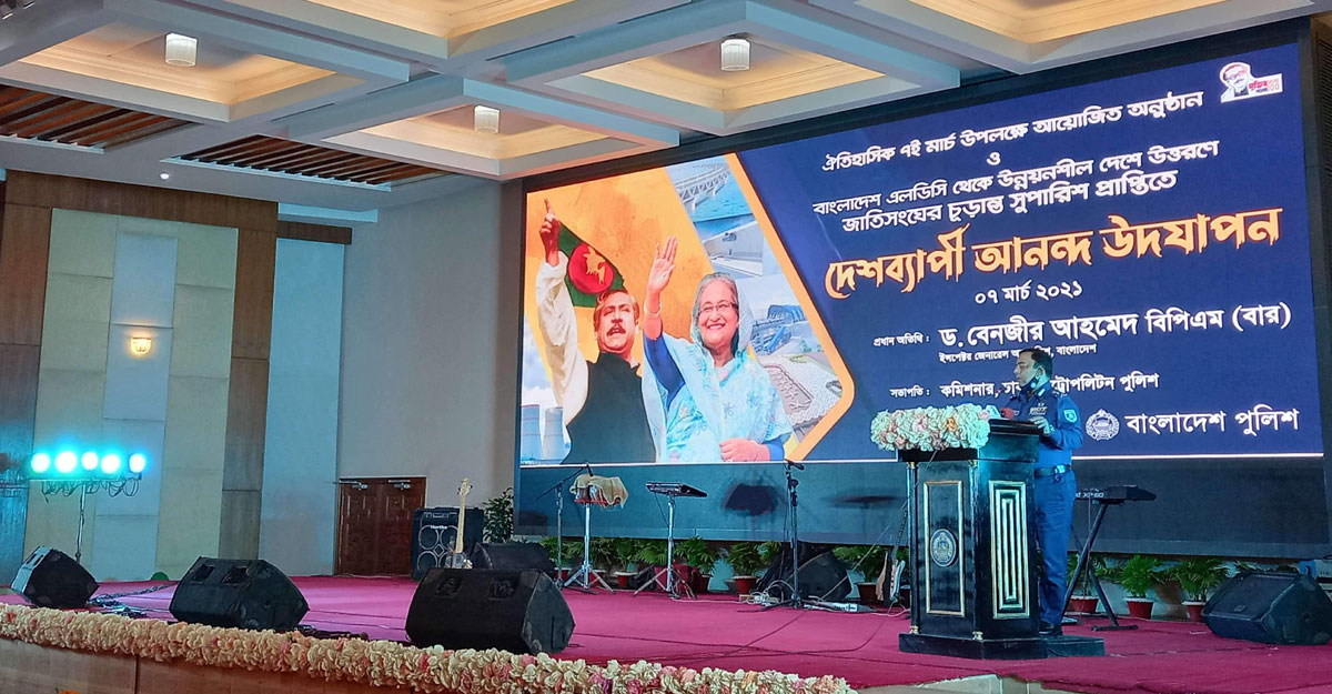 রোববার (৭ মার্চ) বিকেলে রাজারবাগ পুলিশ লাইন্সে ঐতিহাসিক ৭ মার্চ উপলক্ষে আয়োজিত অনুষ্ঠান ও বাংলাদেশ এলডিসি থেকে উন্নয়নশীল দেশে উত্তরণে জাতিসংঘের চূড়ান্ত সুপারিশ প্রাপ্তিতে দেশব্যাপী আনন্দ উদযাপন অনুষ্ঠানে প্রধান অতিথির বক্তব্যে তিনি এসব কথা বলেন।