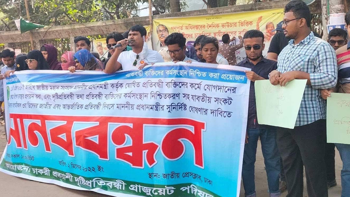 মানববন্ধনে সংগঠনটির আহ্বায়ক মো. আলী হোসেন বলেন, আগামী ৩ ডিসেম্বর জাতীয় ও আন্তর্জাতিক প্রতিবন্ধী দিবস। ২০১৮ সালের ১১ এপ্রিল কোটা বাতিল করে প্রধানমন্ত্রীর ঘোষণা অনুযায়ী প্রতিবন্ধীদের জন্য কর্মক্ষেত্রে যোগদানের বিশেষ নিয়োগ ব্যবস্থা চালু করার কথা থাকলেও আজ পর্যন্ত তা বাস্তবায়ন হয়নি। আমরা অবিলম্বে এটি বাস্তবায়নের দাবি জানাই।