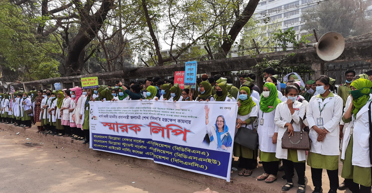 সোমবার (৮ মার্চ) জাতীয় প্রেসক্লাবের সামনে আয়োজিত এক মানববন্ধন থেকে এসব দাবি জানানো হয়। যৌথভাবে এ মানববন্ধনের আয়োজন করে বাংলাদেশ ডিপ্লোমা বেকার নার্সেস অ্যাসোসিয়েশন, বাংলাদেশ ডিপ্লোমা স্টুডেন্ট নার্সেস ইউনিয়ন এবং বাংলাদেশ প্রাইভেট নার্সিং কলেজ অ্যাসোসিয়েশন।