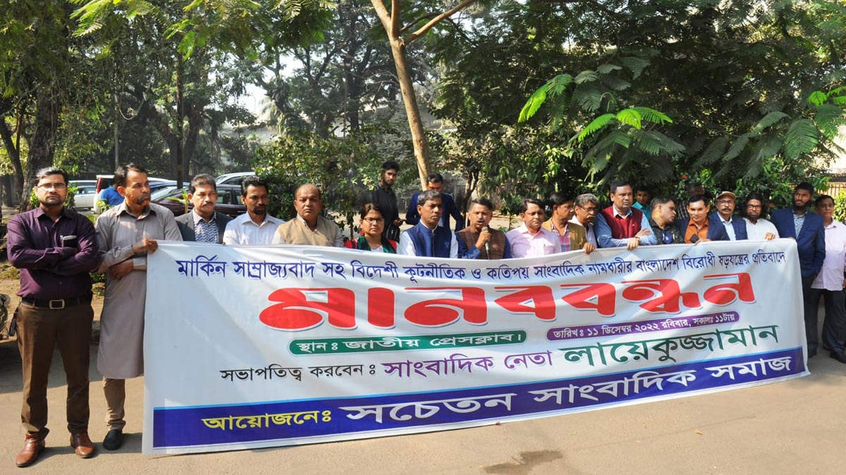 বাংলাদেশের অভ্যন্তরীণ রাজনীতিতে বিদেশি কূটনীতিকদের অযাচিত হস্তক্ষেপ এবং দেশের সাংবাদিক নামধারী কিছু লোকের ‘দেশবিরোধী ষড়যন্ত্রের’ প্রতিবাদে জাতীয় প্রেস ক্লাব চত্বরে এক মানববন্ধন কর্মসূচি পালিত হয়েছে। রোববার (১১ ডিসেম্বর) সকালে সচেতন সাংবাদিক সমাজের ব্যানারে এ মানববন্ধন করা হয়।