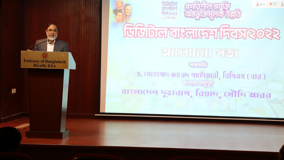 আলোচনা সভায় সৌদি আরবে নিযুক্ত বাংলাদেশের রাষ্ট্রদূত মোহাম্মদ জাবেদ পাটোয়ারী বলেন, ডিজিটাল বাংলাদেশের সেবা আজ সারা দেশের মানুষ পাচ্ছে। দেশে শিক্ষা, স্বাস্থ্য, ব্যাংকিং, বিভিন্ন সরকারি সেবা আজ ডিজিটাল প্রযুক্তির কারণে মানুষের হাতের নাগালে চলে এসেছে। ইন্টারনেটের সহজলভ্যতা ও মোবাইল প্রযুক্তি আজ মানুষের জীবনে বিপুল ইতিবাচক পরিবর্তন নিয়ে এসেছে।