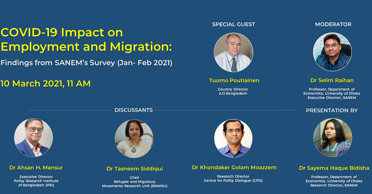 ড. সায়মা হক বিদিশা বলেন, কর্মসংস্থান ও অভিবাসনের ওপর করোনা মহামারির প্রভাব সম্পর্কে ধারণা পেতে সানেম ২০২১ সালের জানুয়ারি-ফেব্রুয়ারি মাসে খানা পর্যায়ে জরিপটি পরিচালনা করে। মোবাইল ফোন কলের মাধ্যমে পরিচালিত এই জরিপে ২৭৩ জন প্রবাসী শ্রমিক, ২৩০ জন দেশের মধ্যে অন্যত্র কাজের জন্য স্থানান্তরিত কর্মী বা শ্রমিক এবং দেশ বা দেশের বাইরে কাজের জন্য স্থানান্তরিত নন এমন ২ হাজার ৮৪৫ জন কর্মী বা শ্রমিকের তথ্য-উপাত্ত সংগ্রহ করা হয়।