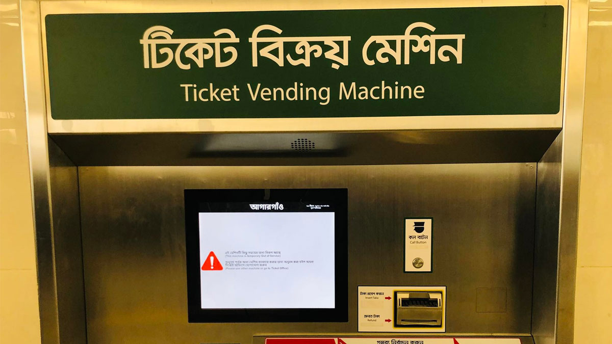 মেট্রোরেলে টিকিট বিক্রয় মেশিন (ভেন্ডিং মেশিন) সাময়িকভাবে বিকল হয়ে গেছে। ৮টা ৩৫ মিনিটে যাত্রীরা প্রবেশ করে টিকিট কাটা শুরু করলে কিছুক্ষণ পর মেশিনটি বিকল হয়ে যায়। নির্দেশনায় বলা হয়, টিকিট অফিসে যোগাযোগ করতে।