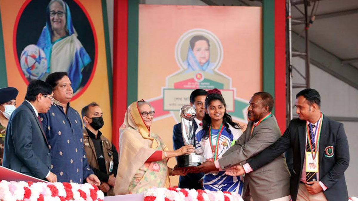 বঙ্গবন্ধু ও বঙ্গমাতা অনূর্ধ-১৭ ফুটবল টুর্নামেন্টের বিজয়ীদের মাঝে পুরস্কার বিতরণ করেন প্রধানমন্ত্রী শেখ হাসিনা/ সংগৃহীত