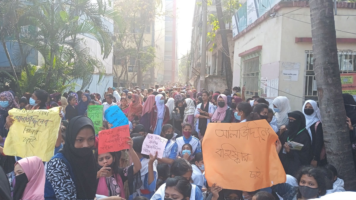 রোববার (১ জানুয়ারি) সকাল থেকে বিদ্যালয়ের মাঠে জড়ো হয়ে আন্দোলন শুরু করে ছাত্রী ও তাদের অভিভাবকরা।