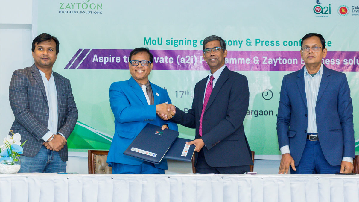 মঙ্গলবার (১৭ জানুয়ারি) রাজধানীর একটি হোটেলে এটুআই এবং জয়তুন বিজনেস সলিউশনসের মধ্যে সমঝোতা স্মারক স্বাক্ষরিত হয়। এটুআইয়ের প্রকল্প পরিচালক ড. দেওয়ান মুহাম্মদ হুমায়ূন কবীর এবং জয়তুন বিজনেস সলিউশনসের চেয়ারম্যান মো. আরফান আলী নিজ নিজ প্রতিষ্ঠানের পক্ষে সমঝোতা স্মারক স্বাক্ষর করেন।