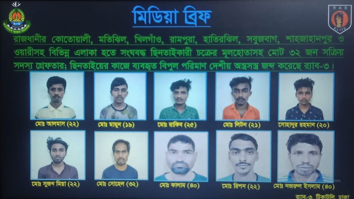 বিভিন্ন উৎসব, মেলাসহ জনসমাগম টার্গেট করা ছিনতাই চক্রের মূলহোতাসহ ৩২ জনকে গ্রেপ্তার করেছে র্যাব। রোববার (২৬ ফেব্রুয়ারি) সন্ধ্যা হতে রাত পর্যন্ত র্যাব-৩ এর কয়েকটি দল একযোগে রাজধানীর বিভিন্ন এলাকায় অভিযান চালিয়ে তাদের গ্রেপ্তার করে।