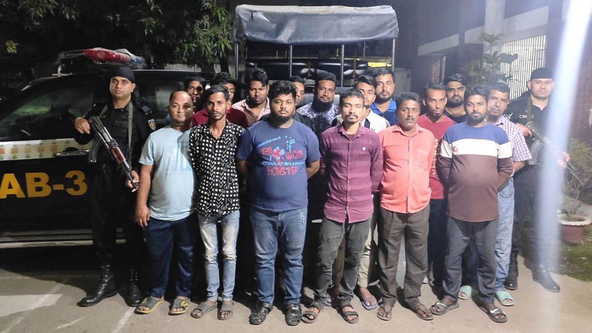 গ্রেপ্তাররা হলেন- মো. রবি (৪৮), সোহেল রানা (২৭), আব্দুল মজিদ (২৬), মো. জুয়েল (২৮), আল আমিন (৩৮), মো. সাগর হোসেন (২০), মো. ফাহিম (২০), মো. ইব্রাহিম (৩১), দেলোয়ার হোসেন (৩৯), রানা ইসলাম (২১), রানা চন্দ্র দাস(২৬), সালাউদ্দিন (৪০), মোশারফ হোসেন (২৫), মো. মানিক (২২), মো. সগির (২৮), পারভেজ হোসেন (২৮), সবুজ গাজী (৩৭), আরিফ হোসেন (২০), মুসা শেখ(২৮), সিদ্দিকুর রহমান (২৫), হাদীদ ইকবাল বাপ্পী (৩৫), শামীম রহমান রাহাত (২৮), মো. ইসমাইল (৩৫), আলী ইসলাম (৫০) ও মো. রাজু (২২)।