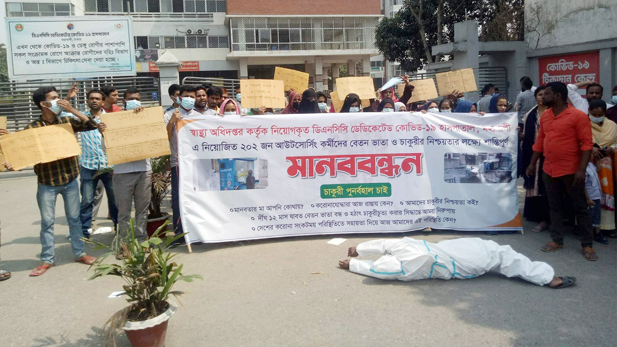 চাকরি নিশ্চিতকরণ ও বেতন-ভাতার দাবিতে মানববন্ধন কর্মসূচি পালন করেছেন ডিএনসিসির কোভিড ডেডিকেটেড হাসপাতালের আউটসোর্সিং কর্মীরা।