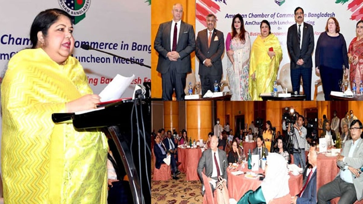 সোমবার (৬ মার্চ) রাজধানীর গুলশানের ওয়েস্টিন হোটেলের বল রুমে আমেরিকান চেম্বার অব কমার্স ইন বাংলাদেশের (অ্যামচেম) উদ্যোগে আয়োজিত ‘উইমেন ইন বিজনেস: এমপাওয়ারিং বাংলাদেশ ফরওয়ার্ড’ শীর্ষক আলোচনা অনুষ্ঠানে প্রধান অতিথির বক্তৃতায় এসব কথা বলেন।
