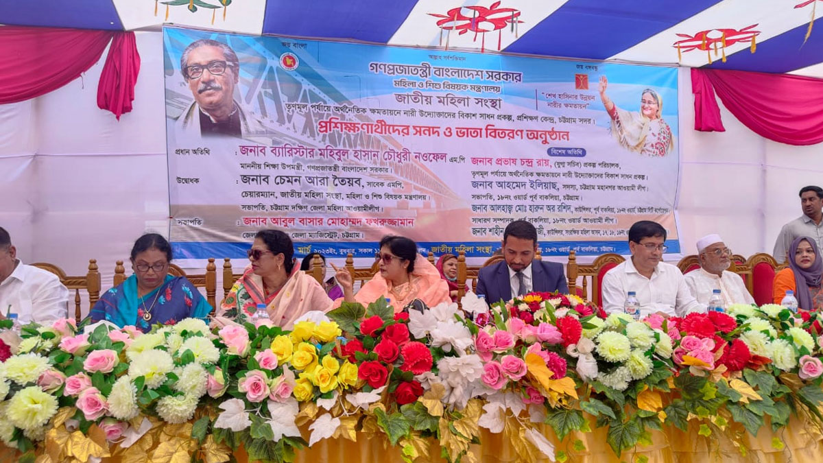 সদর প্রশিক্ষণ কেন্দ্রের সাতটি ট্রেডের মোট ৩১২ জন নারীকে চেক ও সনদ বিতরণ করা হয়। অনুষ্ঠানে যুক্ত হয়ে প্রধান অতিথি হিসেবে বক্তব্য রাখেন শিক্ষা উপমন্ত্রী ব্যারিস্টার মহিবুল হাসান চৌধুরী নওফেল।