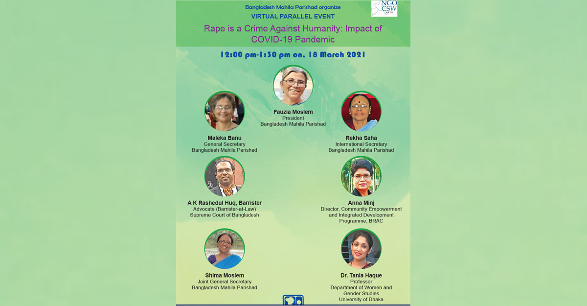 বৃহস্পতিবার (১৮ মার্চ) দুপুর ১২টায় বাংলাদেশ মহিলা পরিষদের কেন্দ্রীয় কমিটির উদ্যোগে নিউইয়র্কে জাতিসংঘের কমিশন অন দ্য স্ট্যাটাস অব উইমেনের (সিএসডব্লিউ) ৬৫তম অধিবেশনে ‘রেপ ইজ অ্যা ক্রাইম অ্যাগেইনস্ট হিউম্যানিটি; ইমপেক্ট অব কোভিড-১৯ পেনডেমিক’ শীর্ষক ইভেন্টে সভাপতির বক্তব্যে এসব কথা বলেন তিনি।