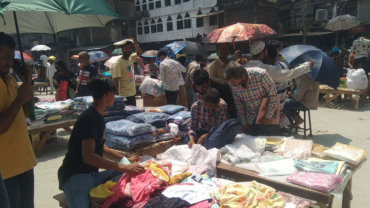 আরা যারা চৌকিতে বসেছেন, তাদের কেউ প্যান্ট, কেউবা শার্ট, পাঞ্জাবি, শিশুদের পোশাক কেউবা শাড়ি বিক্রি করছেন। তীব্র গরমের কারণে অসুবিধা হচ্ছে বলে জানিয়েছেন এই ব্যবসায়ীরা।