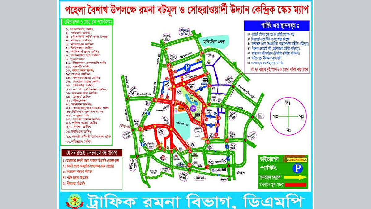 পয়লা বৈশাখে রমনা ও ঢাকা বিশ্ববিদ্যালয় এলাকায় যানবাহন চলাচলে শৃঙ্খলার স্বার্থে ঢাকা মেট্রোপলিটন পুলিশের ট্রাফিক বিভাগের পক্ষ থেকে বিশেষ ট্রাফিক ব্যবস্থা নেওয়া হয়েছে। বেশকিছু সড়কে যান চলাচল বন্ধ ও ডাইভারশন করা হবে। যানবাহনের পার্কিংয়ের জন্য নির্দিষ্ট করে দেওয়া হয়েছে স্থান।