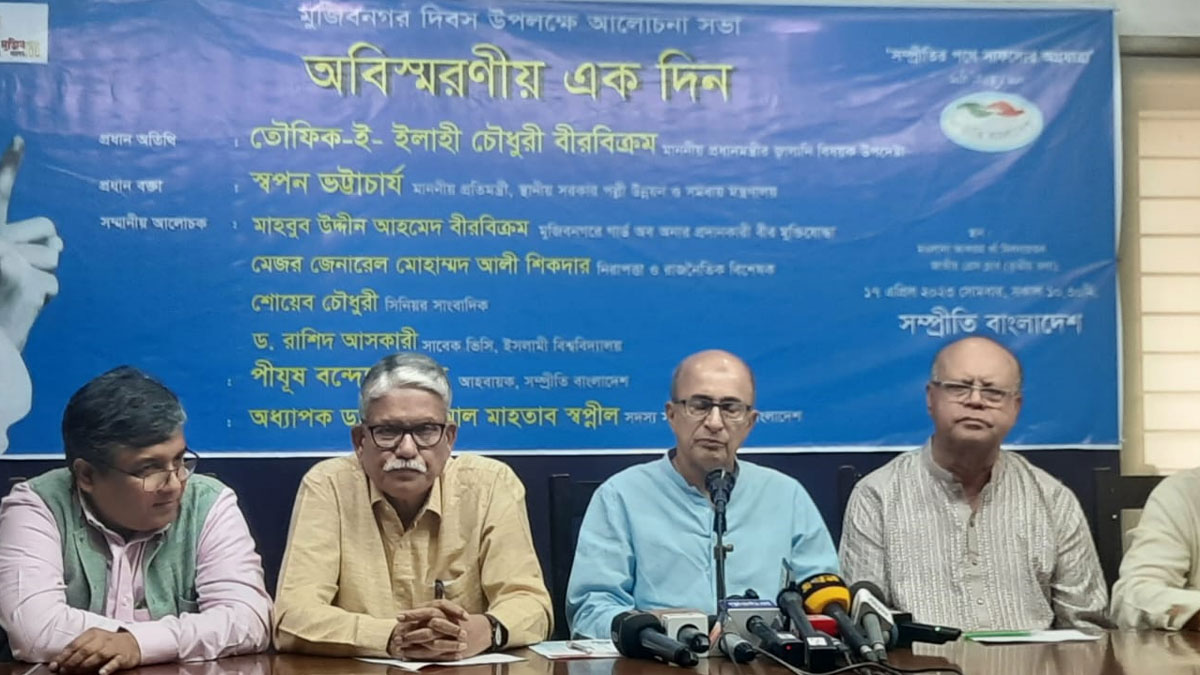সোমবার (১৭ এপ্রিল) রাজধানীর প্রেসক্লাবের মাওলানা আকরাম খাঁ মিলনায়তনে ঐতিহাসিক মুজিবনগর দিবস উপলক্ষ্যে সম্প্রীতি বাংলাদেশের আয়োজিত ‘অবিস্মরণীয় এক দিন’ শীর্ষক আলোচনা সভায় এসব কথা বলেন বক্তারা।