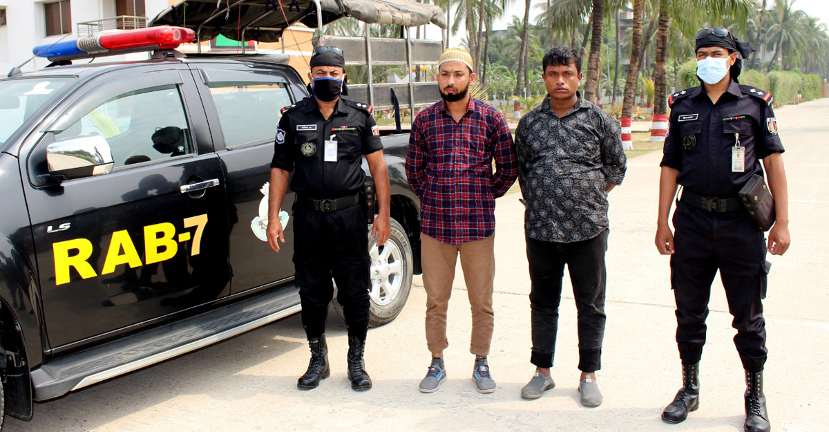 র্যাব-৭ এর সহকারী পরিচালক মো. নুরুল আবছার এ তথ্য নিশ্চিত করেছেন। গ্রেফতাররা হলেন- কক্সবাজারের টেকনাফের মো. কাইয়ুমের ছেলে মো. শহিদুল ইসলাম (২৮) ও টেকনাফের মো. আমিনের ছেলে কবির আহমদ।