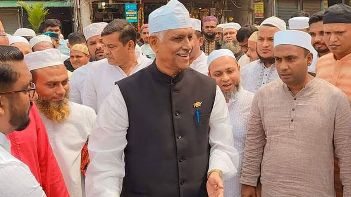 গত শুক্রবার নামাজ শেষে লোকজনের সঙ্গে কুশল বিনিময় করেন আজমত উল্লাহ খান/ফাইল ছবি
