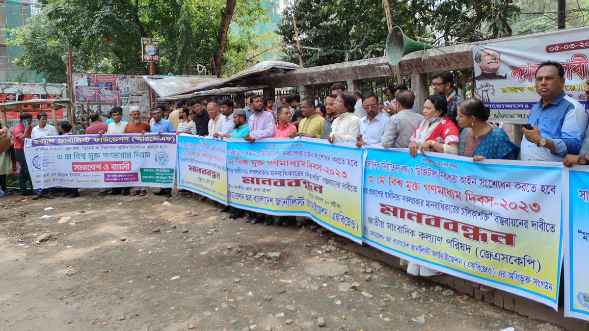 বুধবার (৩ মে) বেলা সাড়ে ১১টার দিকে প্রেসক্লাবে প্রাঙ্গণে এ মানববন্ধন অনুষ্ঠিত হয়। ৩ মে বিশ্ব মুক্ত গণমাধ্যম দিবস উপলক্ষ্যে এ মানববন্ধনের আয়োজন করা হয়।