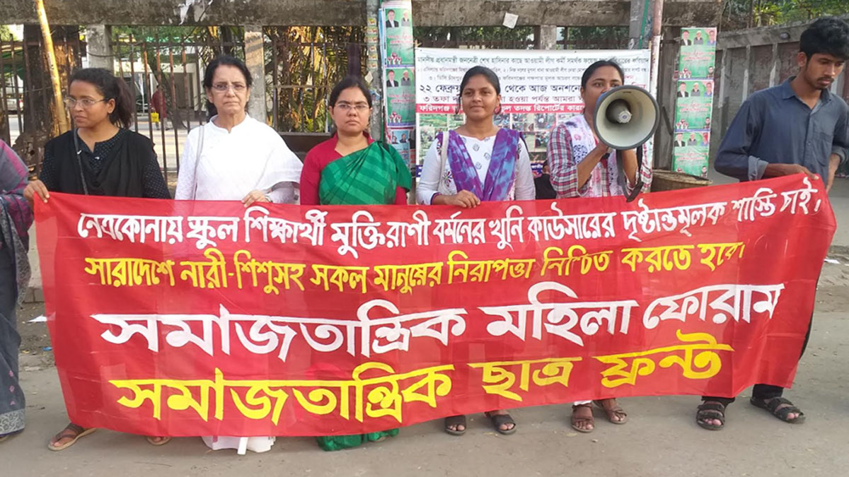 নেত্রকোনার প্রেমনগর ছালিপুরা বিদ্যালয়ের দশম শ্রেণির শিক্ষার্থী মুক্তি বর্মনকে হত্যার দ্রুত বিচার ও হত্যাকারীর দৃষ্টান্তমূলক শাস্তির দাবিতে মানববন্ধন ও প্রতিবাদ সমাবেশ করেছে সমাজতান্ত্রিক মহিলা ফোরাম ও সমাজতান্ত্রিক ছাত্র ফ্রন্ট।