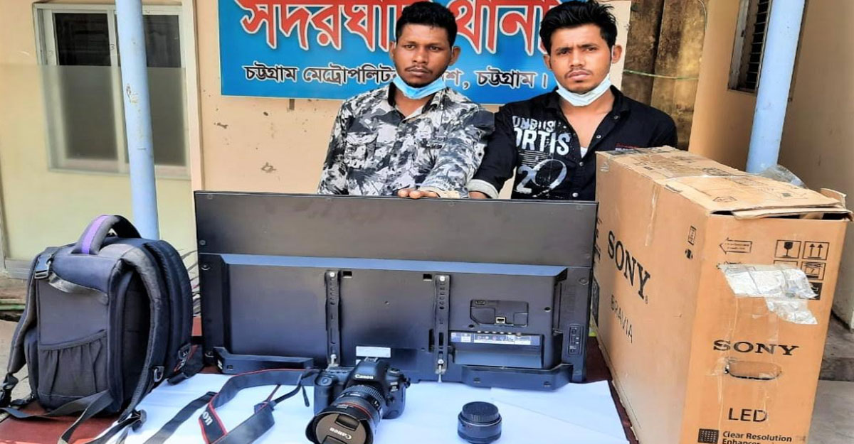 গ্রেফতারকৃতরা হলেন- চট্টগ্রামের কর্ণফুলী থানার মো. বাবুল (৩০) ও শাহিন মিয়া। এসময় তাদের কাছ থেকে একটি ক্যাননের একটি ক্যামেরা, দুটি ল্যান্স, তিনটি ব্যাটারি ও দুটি মেমোরি কার্ড, একটি ৩২ ইঞ্চি এলইডি টিভি উদ্ধার করা হয়।