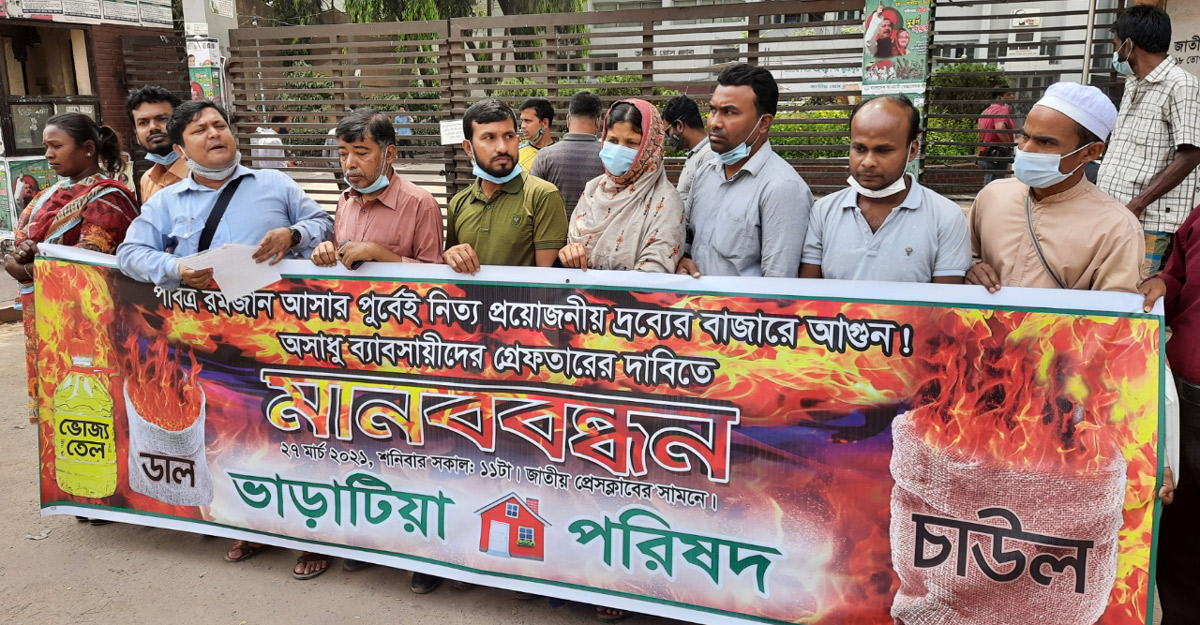 শনিবার (২৭ মার্চ) জাতীয় প্রেসক্লাবের সামনে আয়োজিত এক মানববন্ধনে ভাড়াটিয়া পরিষদের সভাপতি বাহারানে সুলতান বাহার এসব কথা বলেন। এ সময় তিনি বাজারে নিত্যপ্রয়োজনীয় দ্রব্যের দাম বাড়ানোর জন্য দায়ী ব্যবসায়ীদের গ্রেফতারের দাবিও জানান।