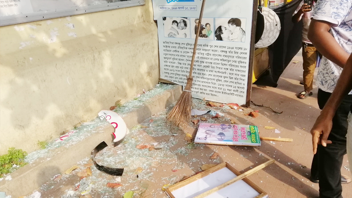 ওই মিছিলটি জামাল খান মোড়ে পৌঁছালে বিএনপির নেতাকর্মীরা লাঠিসোটা নিয়ে বিভিন্ন দেওয়ালে অঙ্কিত বঙ্গবন্ধুর রাজনৈতিক জীবনের স্থিরচিত্র সম্বলিত চল্লিশটি ট্যাম্পার্ড, গ্লাস, মুর্যাল, নৌকার প্রতীক ভাঙচুর করে। এরপর মিছিলটি কাজির দেউরি মোড়ের দিকে অগ্রসর হয়। পরবর্তী সময়ে একই মিছিল থেকে আসকারদিঘী সংলগ্ন আঞ্চলিক লোক প্রশাসন কেন্দ্রের কাঁচের নাম ফলক, সিসি ক্যামেরা, মানবতার দেয়াল ভাঙচুর করা হয়।