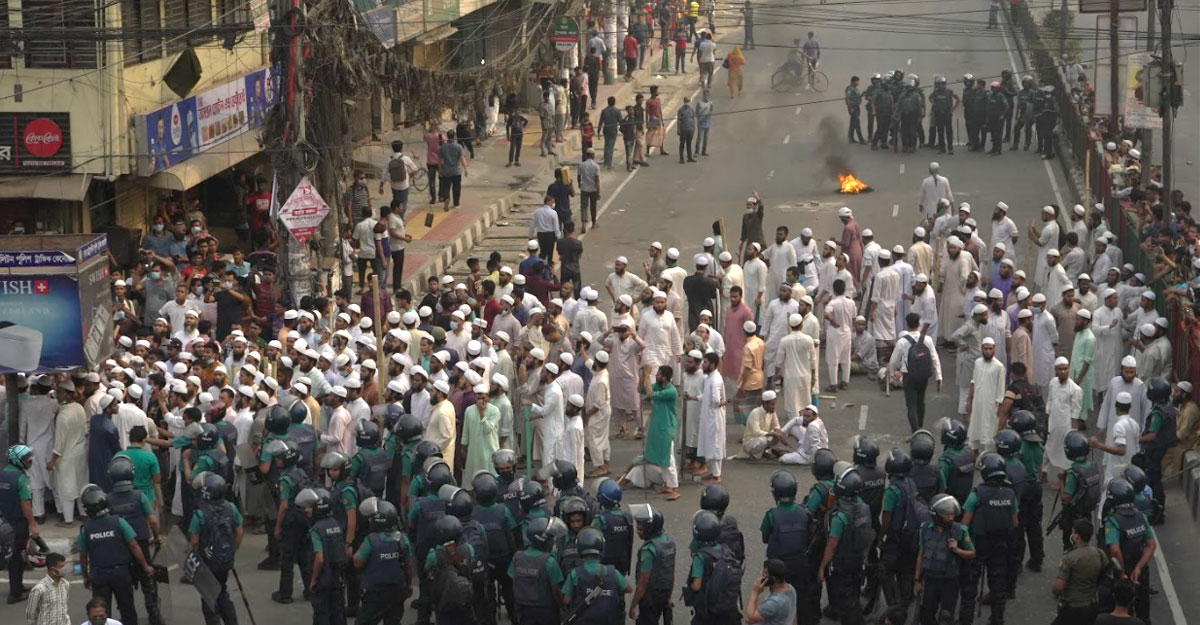 সরেজমিনে দেখা গেছে, রাজধানীর যমুনা ফিউচার পার্কের মূল গেট সংলগ্ন এলাকায় অবস্থান নিয়ে হেফাজতের কর্মীরা হরতালের সমর্থনে মিছিল-অবরোধ করছেন। এ সময় তারা ‘নারায়ে তাকবির আল্লাহু আকবর’, ‘আমার ভাই শহীদ কেন, জবাব চাই জবাব চাই’ এ ধরনের স্লোগান দিচ্ছিলেন।