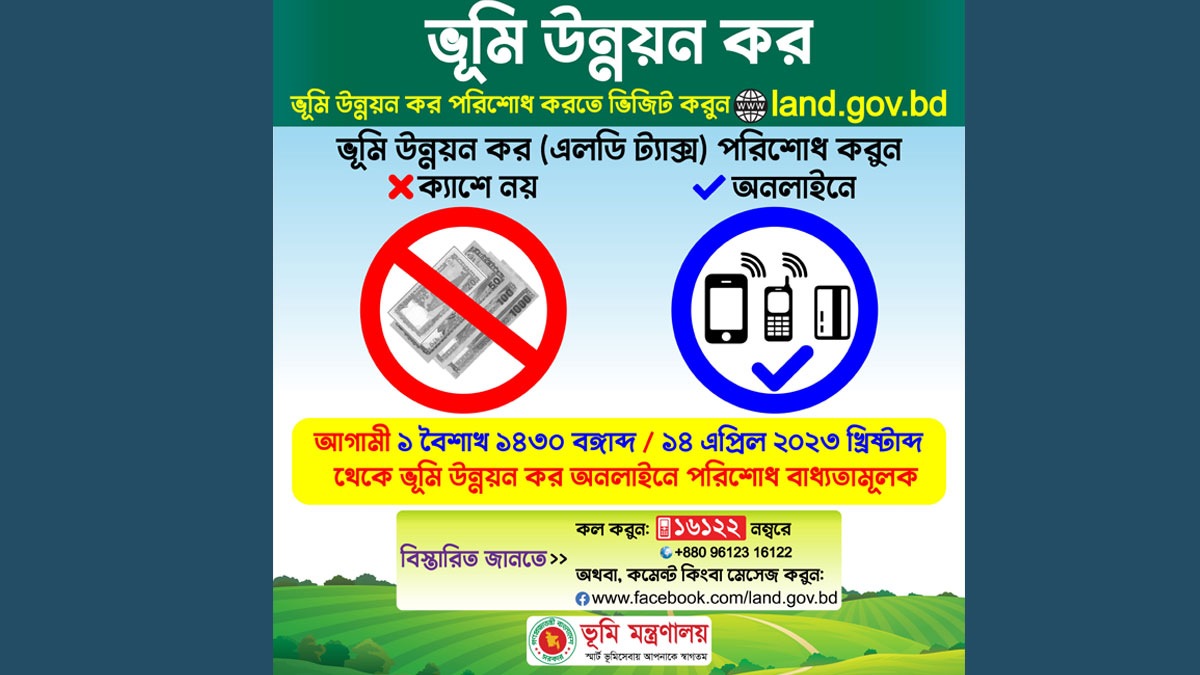 গত ২৯ মার্চ ঢাকায় অনুষ্ঠিত জাতীয় ভূমি সম্মেলনের উদ্বোধনী অনুষ্ঠানে ১৪ এপ্রিল থেকে সম্পূর্ণ ক্যাশলেস ভূমি উন্নয়ন কর ব্যবস্থা কার্যকর করার ঘোষণা দিয়েছিলেন প্রধানমন্ত্রী শেখ হাসিনা। সে অনুযায়ী গত ১৪ এপ্রিল থেকে এ কাজ সম্পূর্ণ অনলাইনেই হচ্ছে।