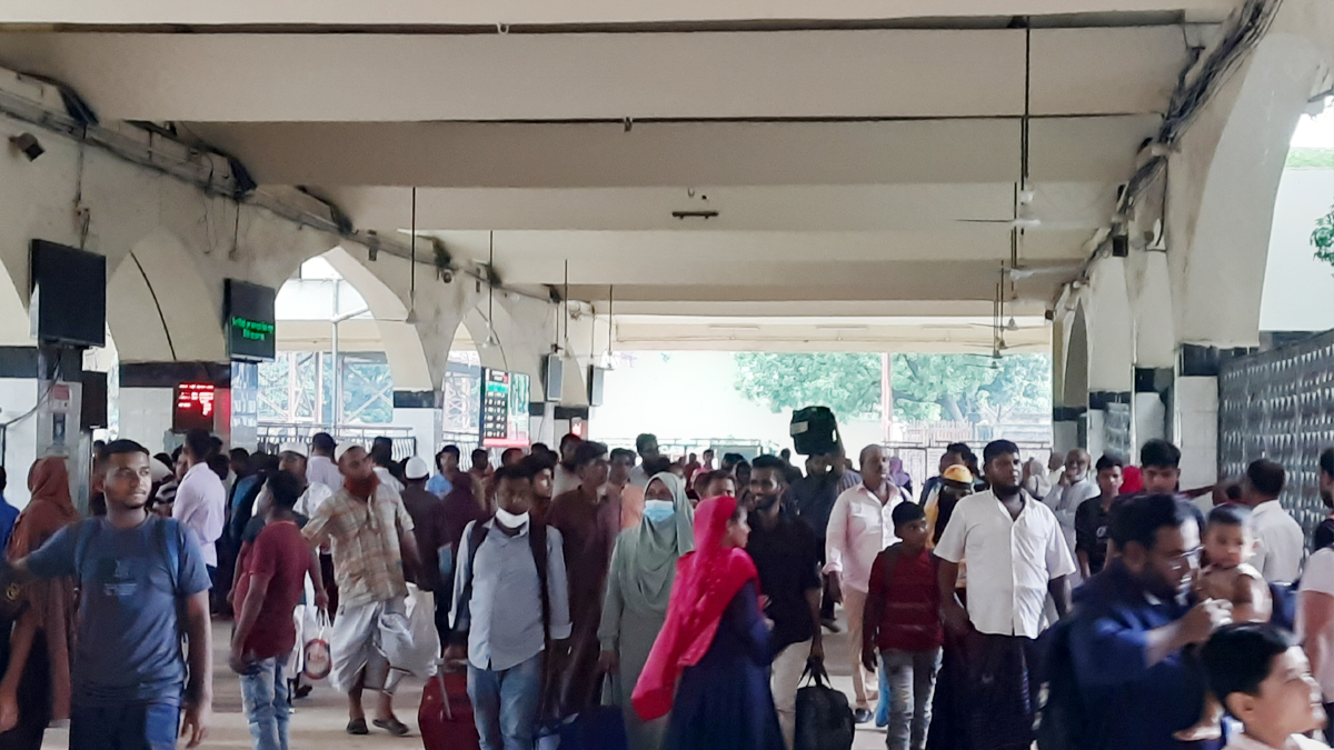 বেলা ৩টার কালনী এক্সপ্রেসে করে সিলেটে যাবেন বৃদ্ধ হারুন আলী ও তার স্ত্রী খাদিজা। ঈদের সময় বাড়ি না যাওয়ার কারণ কী জানতে চাইলে তিনি বলেন, ঈদের সময় ট্রেনে অনেক ভিড় থাকে। তাছাড়া এখানে থাকার কারণে কিছু মাংস চেয়ে নিয়েছি মানুষের কাছ থেকে। বাড়িতে গেলে তো এগুলো পেতাম না। তাই আজকে বাড়ি যাচ্ছি।