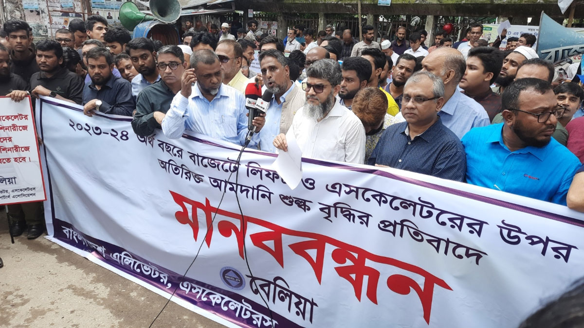 মানববন্ধনে বেলিয়া সাধারণ সম্পাদক শফিউল আলম উজ্জ্বল বলেন, করোনা পরবর্তী গত ২০২২-২৩ অর্থবছরে বিশ্বব্যাপী যুদ্ধবিগ্রহ, মুদ্রাস্ফীতি স্থায়ী মন্দা, বিভিন্ন দেশে মুদ্রার অবমূল্যায়ন ইত্যাদি কারণে লিফট সরবরাহকারী প্রতিষ্ঠানগুলো চরম আর্থিক ক্ষতির সম্মুখীন হয়। তারপরও গত অর্থবছরে লিফটের ওপরে ৫ শতাংশ শুল্কবৃদ্ধি করাতে আমাদানিকারদের আরও বেগতিক অবস্থায় পড়তে হয়েছে এবং গত অর্থবছরে লিফটকে ক্যাপিটাল মেশিনারিজ থেকেও অব্যাহতি দেওয়া হয়।