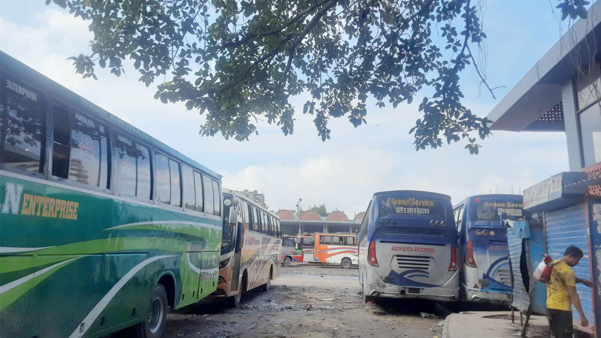 পরিবহন শ্রমিকরা বলছেন, অন্যান্য দিন যেখানে টার্মিনালের প্রবেশ পথে সিরিয়াল লেগেই থাকে আজ সেখানে বাস একেবারেই কম আসছে।
