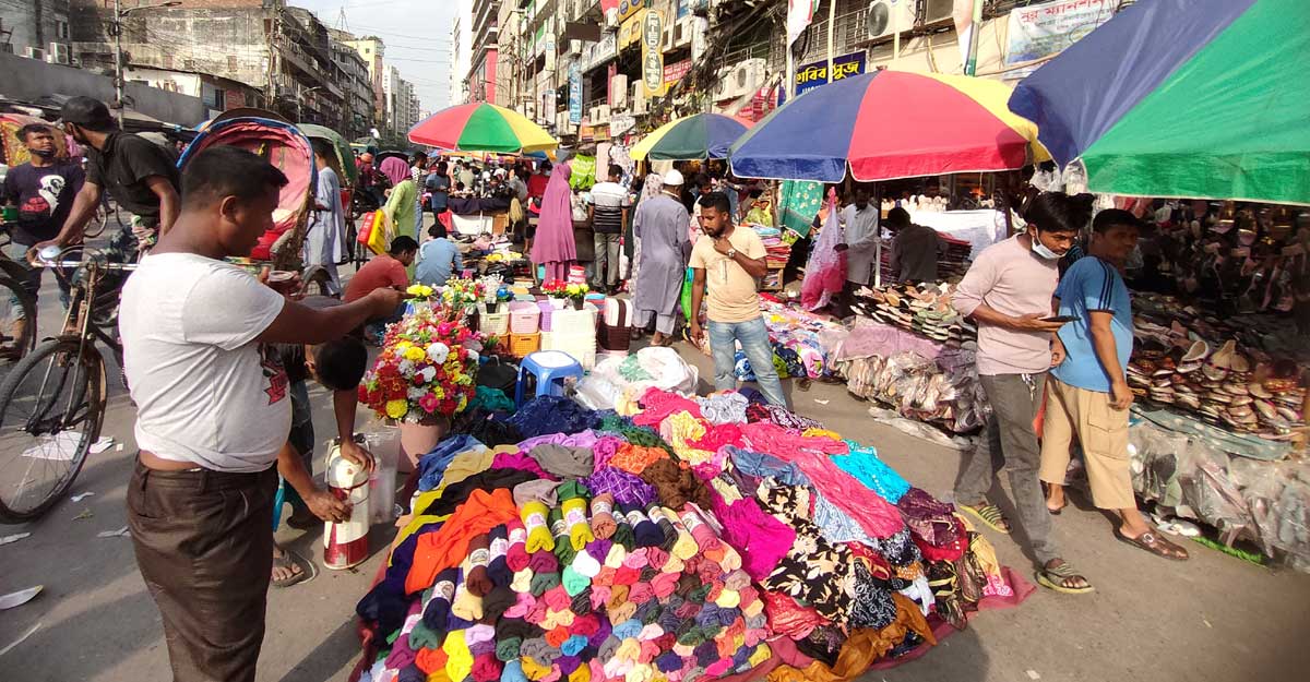 নিউ মার্কেটের ভেতরে এবং ফুটপাতের দোকানগুলোতে হাজারও মানুষের সমাগম হচ্ছে। সরেজমিনে দেখা গেছে, এসব মার্কেটে ক্রেতা এবং বিক্রেতাদের অর্ধেকেরও বেশি মানুষের মুখে নেই মাস্ক। বিক্রেতারা যেন ভুলেই গেছেন মাস্ক পরার কথা। নিউ মার্কেটের ভাসমান ব্যবসায়ী হাসান মিয়া বলেন, কপালে যদি করোনা থাকে তাহলে কেউ ঠেকাতে পারবে না। আমরা গরিব মানুষ, এতকিছু দেখলে না খেয়ে মরতে হবে।