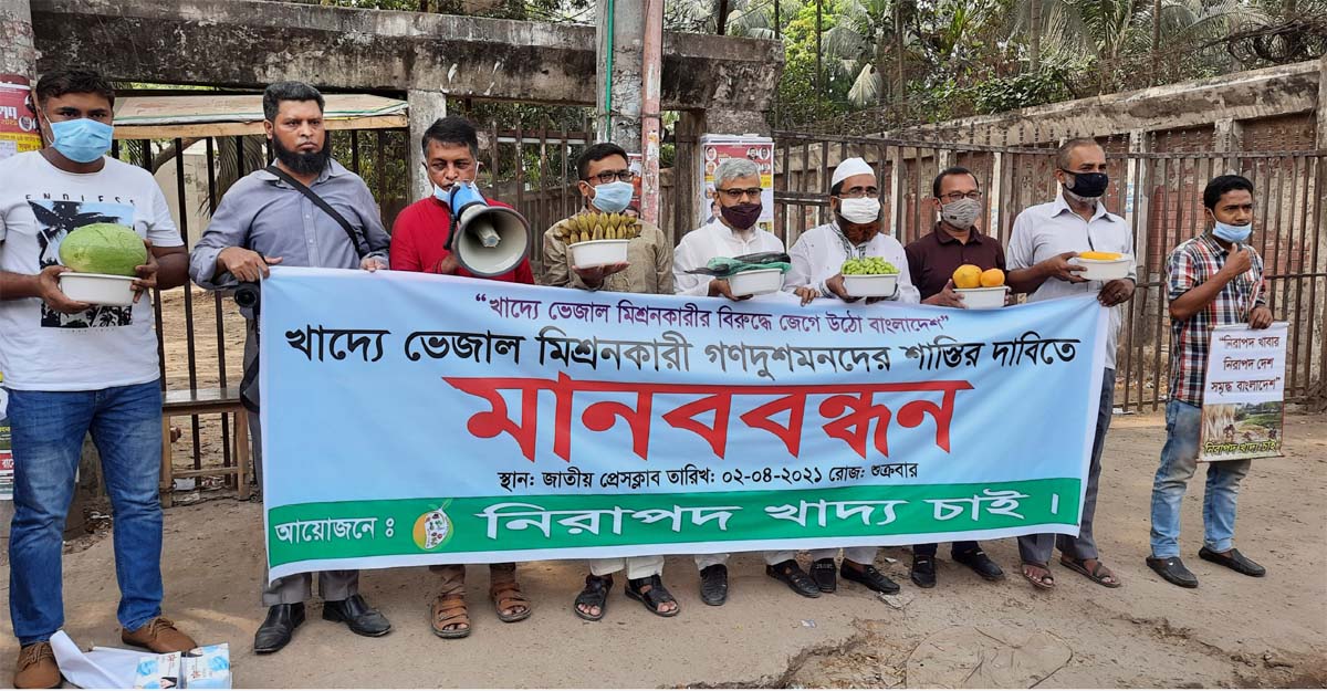 শুক্রবার (২ এপ্রিল) সকালে জাতীয় প্রেসক্লাবের সামনে অনুষ্ঠিত মানববন্ধনে তারা এ আহ্বান জানান। নিরাপদ খাদ্য চাই ব্যানারে এ মানববন্ধনের আয়োজন করা হয়।