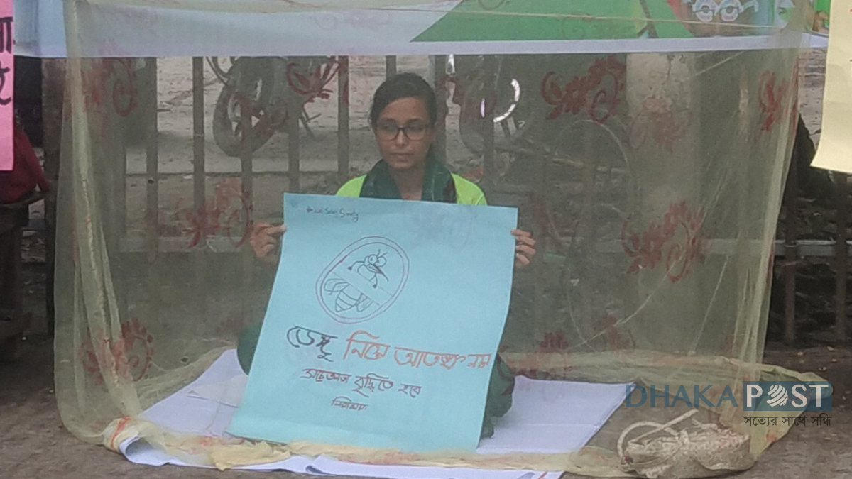 প্রেসক্লাবের সমনে ফুটপাতের ওপর মশারি টানিয়ে বসেছেন এক তরুণী। তার পাশে আরও কয়েকজন দাঁড়িয়ে। হাতে ডেঙ্গু প্রতিরোধে জনসচেতনতায় বিভিন্ন প্ল্যাকার্ড।