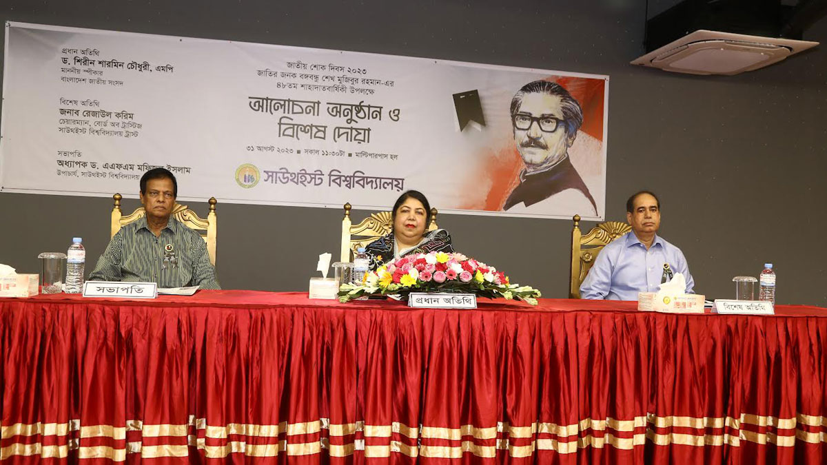 বৃহস্পতিবার (৩১ আগস্ট) রাজধানীর সাউথ-ইস্ট ইউনিভার্সিটির মাল্টিপারপাস হলে জাতির পিতা বঙ্গবন্ধু শেখ মুজিবুর রহমানের ৪৮তম শাহাদাত বার্ষিকী এবং জাতীয় শোক দিবস উপলক্ষ্যে আয়োজিত আলোচনা সভা ও দোয়া মাহফিলে তিনি এসব কথা বলেন।