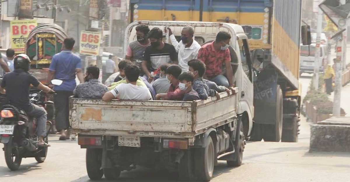 মঙ্গলবার (৬ এপ্রিল) সকাল থেকে চাকরি বা জরুরি কাজে বাইরে বের হওয়া মানুষদের জীবনের ঝুঁকি নিয়ে ট্রাকে করে চলাচল করতে দেখা গেছে। আবার কেউ কেউ পায়ে হেঁটে অথবা অতিরিক্ত ভাড়ায় রিকশায় গন্তব্যে গেছেন। এছাড়া নিয়ম না মেনে সকালের দিকে চলাচল করা দুয়েকটি বাসেও যাত্রীদের ধাক্কাধাক্কি করে চড়তে দেখা গেছে।