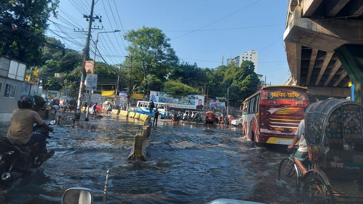চট্টগ্রামের আকাশে শনিবার (১৬ সেপ্টেম্বর) সকাল থেকে রোদ, কোথাও মেঘের কোনো চিহ্ন নেই। তারপরও দিনে-দুপুরে নগরের জিইসি মোড় এলাকার সড়কে হঠাৎ অনেক পানি দেখা গেছে। প্রায় হাঁটু সমান এ পানি মংলা ও দুর্গন্ধযুক্ত। ময়লা পানির ওপর দিয়ে চলাচল করতে বেশ বেগ পেতে হচ্ছে পথচারীদের। দিনে দুপুরের তপ্ত রোদেও সড়কে পানি দেখতে পেয়ে বিস্ময় প্রকাশ করেন অনেকেই।