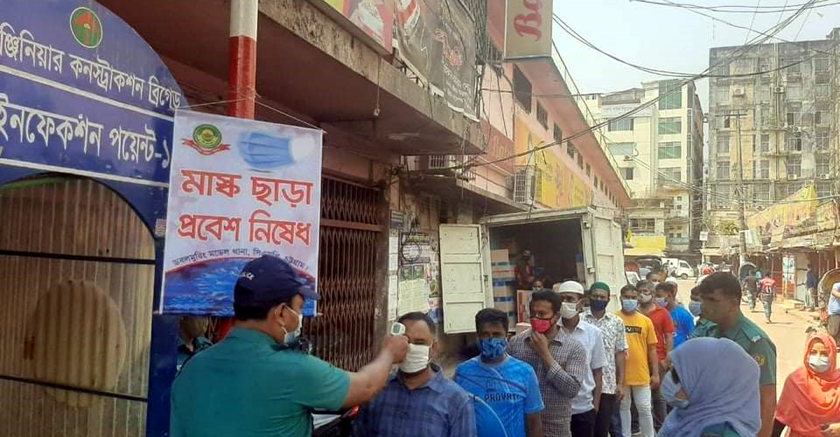 বাজারের প্রবেশমুখে মাপা হচ্ছে তাপমাত্রা/ ছবি- ঢাকা পোস্ট