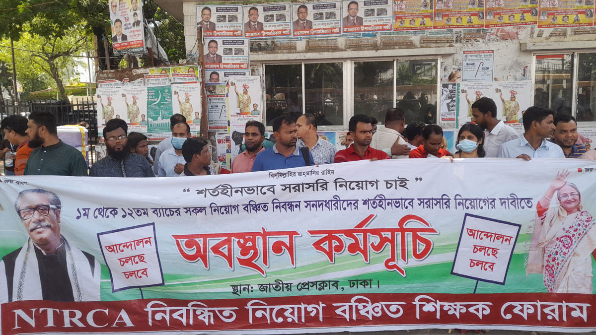 শর্তহীনভাবে সরাসরি নিয়োগ কার্যকর করার দাবিতে প্রধানমন্ত্রীর সাক্ষাৎ চেয়ে অবস্থান কর্মসূচি পালন করছে 'এনটিআরসিএ নিবন্ধিত নিয়োগবঞ্চিত শিক্ষক ফোরাম'।