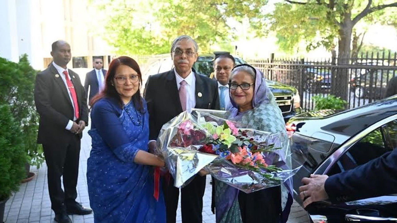 এর আগে, সরকারপ্রধান দূতাবাসে পৌঁছালে তাকে ফুলের তোড়া দিয়ে স্বাগত জানান যুক্তরাষ্ট্রে বাংলাদেশের রাষ্ট্রদূত মোহাম্মদ ইমরান।