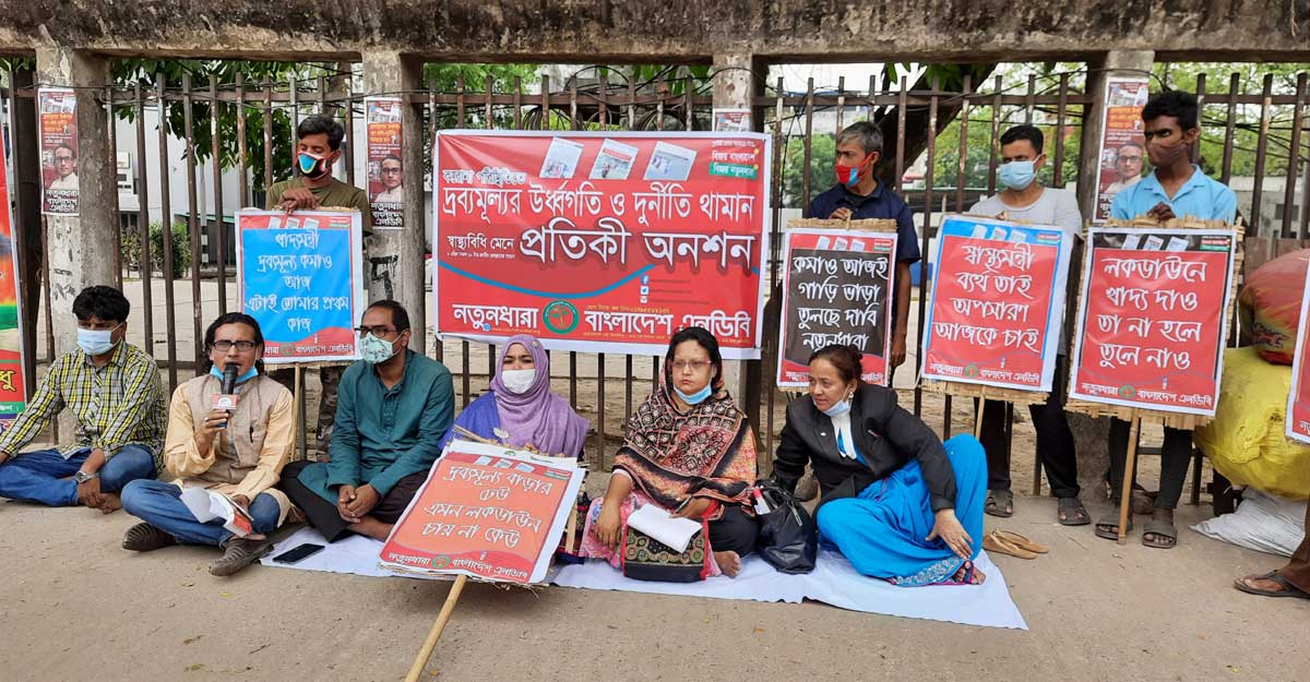দ্রব্যমূল্যের ঊর্ধ্বগতি ও দুর্নীতি থামানোর দাবি জানিয়েছে নতুনধারা বাংলাদেশ (এনডিবি) নামে একটি সংগঠন। বৃহস্পতিবার (৮ এপ্রিল) জাতীয় প্রেসক্লাবের সামনে সংগঠনটি আয়োজিত এক প্রতীকী অনশন থেকে এ দাবি জানানো হয়।