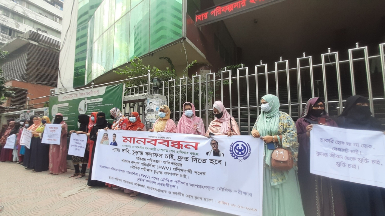 মানবন্ধনে দিনাজপুর থেকে আসা তানিয়া মোস্তাকিম ঢাকা পোস্টকে বলেন, পরিবার পরিকল্পনা অধিদপ্তরের অধীনে পরিবার কল্যাণ পরিদর্শিকা পদের জন্য ২০২০ সালে সার্কুলার প্রকাশিত হয়। অনলাইনে আবেদন শুরু হয় ২০২০ সালের ১৬ মার্চ এবং শেষ হয় ২০ এপ্রিল। তারপর দীর্ঘ ২ বছর ৯ মাস পর গত ১৮ ফেব্রুয়ারি ওই পদের জন্য লিখিত পরীক্ষা অনুষ্ঠিত হয়। সর্বশেষ ধাপে ধাপে ২৫ মে থেকে ১৮ জুন পর্যন্ত মৌখিক পরীক্ষা শেষ হয়। কিন্তু ৩ মাস ২০ দিন পার হলেও চূড়ান্ত ফলাফল প্রকাশ হয়নি এখনো।