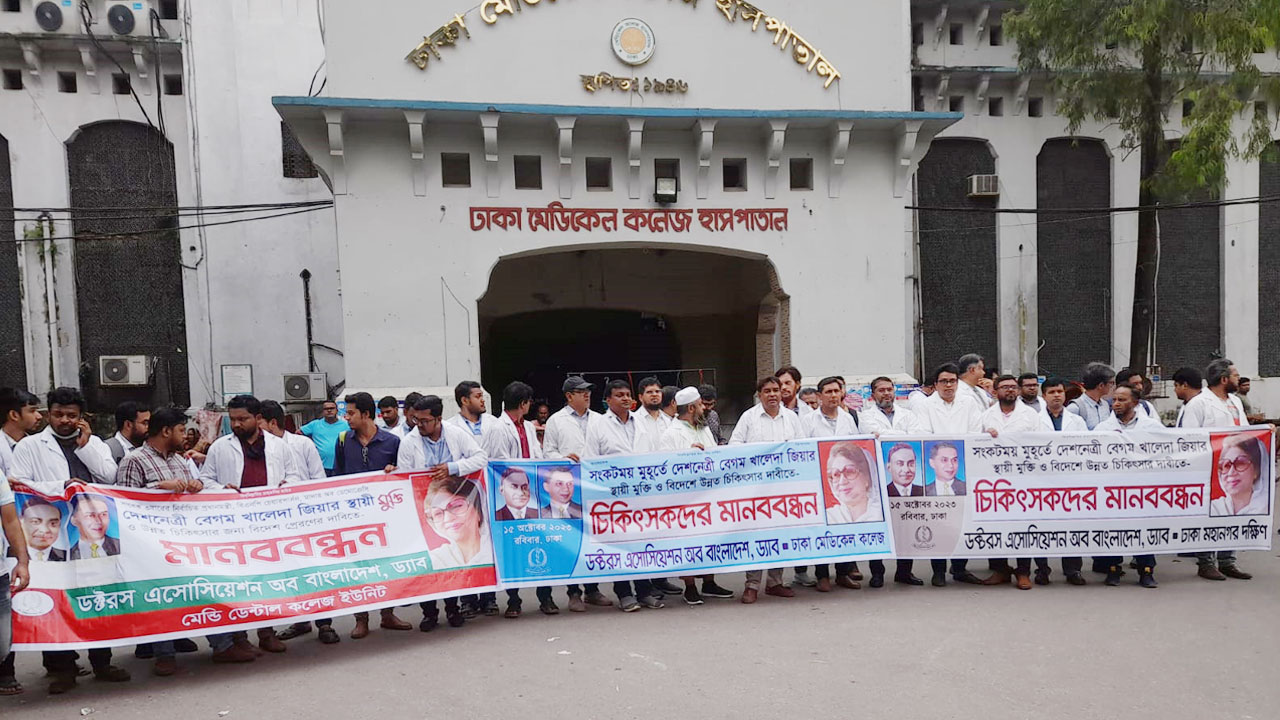 ঢাকা মেডিকেল কলেজ (ঢামেক) হাসপাতালের বাগান গেটে বিএনপি চেয়ারপার্সন খালেদা জিয়ার স্থায়ী মুক্তি ও বিদেশে উন্নত চিকিৎসার দাবিতে মানববন্ধন করেছে ডক্টরস অ্যাসোসিয়েশন অব বাংলাদেশ (ড্যাব)।
