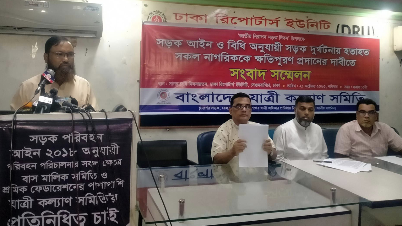 শনিবার (২১ অক্টোবর) ঢাকা রিপোর্টার্স ইউনিটির সাগর-রুনী মিলনায়তনে জাতীয় নিরাপদ সড়ক দিবস উপলক্ষে আয়োজিত সংবাদ সম্মেলনে এসব দাবি জানান বাংলাদেশ যাত্রী কল্যাণ সমিতির মহাসচিব মো. মোজাম্মেল হক চৌধুরী।