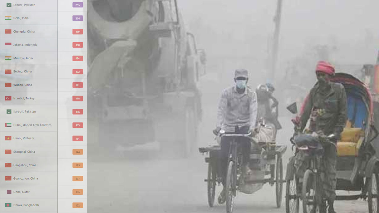 পাকিস্তানের লাহোর, ভারতের দিল্লি ও চীনের শেংদু যথাক্রমে ২৫৫, ২০৪ ও ১৭৯ একিউআই স্কোর নিয়ে তালিকার প্রথম তিনটি স্থান দখল করেছে।