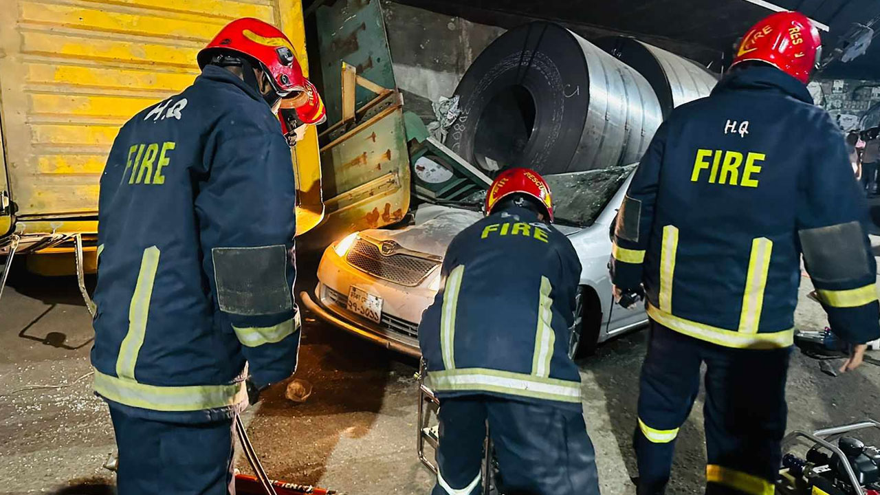 ওয়ারীতে কাভার্ড ভ্যানের নিচে প্রাইভেটকার, নিহত ১