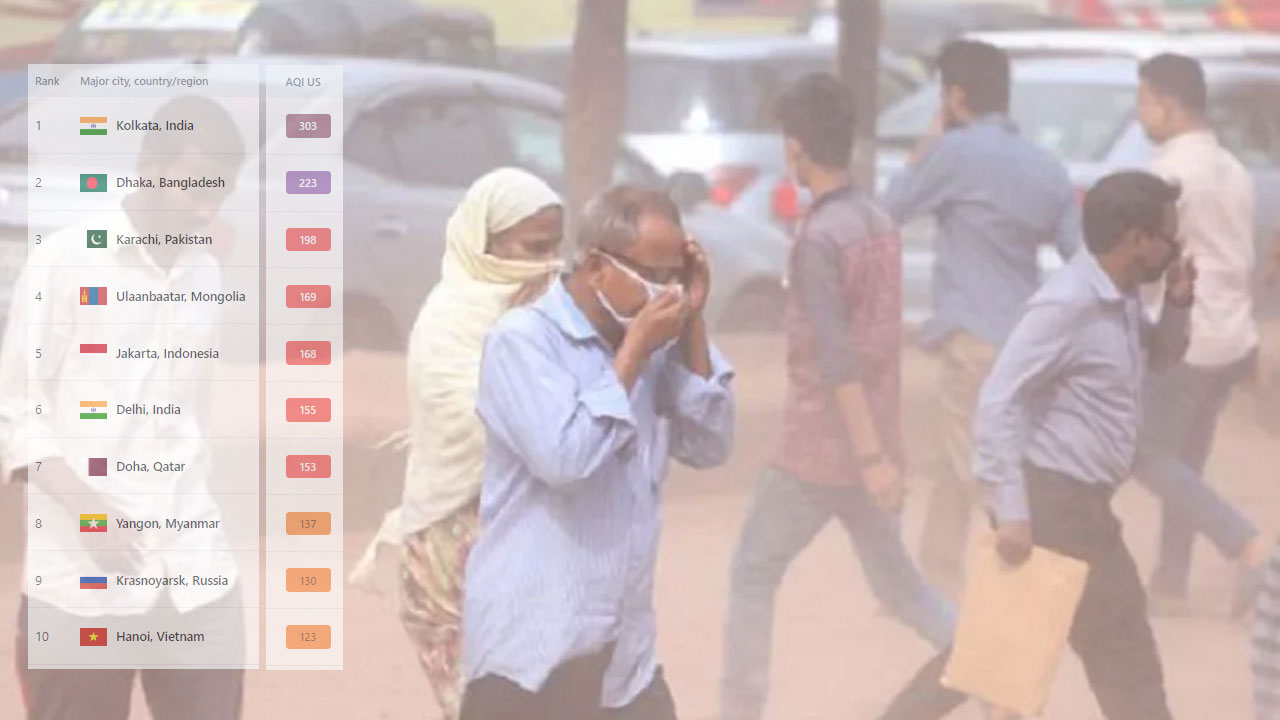 আজ দূষিত বায়ুর শহরগুলোর তালিকায় প্রথম স্থানে রয়েছে ভারতের কলকাতা। কলকাতার স্কোর ৩০৩। এই স্কোর ৩০০-এর ওপরে উঠলেই তাকে বিপজ্জনক বলে বিবেচনা করা হয়।