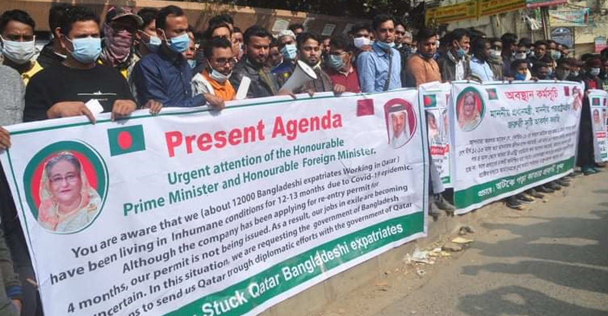 বিক্ষোভে অংশ নেওয়া প্রবাসীরা জানান, করোনার কারণে প্রায় ১২ হাজার কাতার প্রবাসী দেশে আটকা পড়েছেন। গত ১২-১৩ মাস ধরে আমরা দেশে মানবেতর জীবনযাপন করছি। এর মধ্যে ৯৫ শতাংশ কর্মীর ইকামার মেয়াদ শেষ। গত চার মাস ধরে আমরা রি-এন্ট্রি পারমিটের আবেদন করেছি। আমাদের আবেদন নেওয়া হচ্ছে না। পার্শ্ববর্তী দেশ ভারতে করোনার প্রকোপ অনেক বেশি, অথচ সেখান থেকে দেশটির শ্রমিকরা কাতারে যাচ্ছে। এর ফলে আমাদের চাকরি নিয়ে অনিশ্চয়তা তৈরি হয়েছে। এই অবস্থায় কূটনৈতিক প্রচেষ্টার মাধ্যমে আমাদের কাতার পাঠানোর ব্যবস্থা করার দাবি জানাচ্ছি।